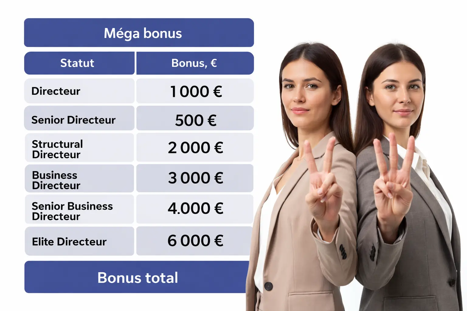 - Accessibilité Immédiate : Vous débloquez vos premiers bonus d’équipe dès 100 € de chiffre d’affaires (Statut Consultant).